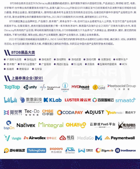 BTOB综合商务洽谈区作为ChinaJoy展会重要的组成部分,是开展数字娱乐内容版权交易、产品进出口、跨领域(综艺、电影、文学等IP)合作等业务的重要商务对接平台。自第9届ChinaJoy开设设立BTOB展区至今已发展成为亚洲数字娱乐领域综合实力最强、参展企业最全、展览面积最大、接待观众最多的专业展览及商务洽谈活动,也是目前开展中外游戏产业版权合作、联合开发、联合运营等业务的重要商务对接平台。2021年BTOB展商共计200余家,展览面积达1.6万平米。