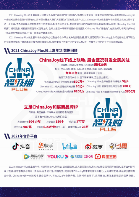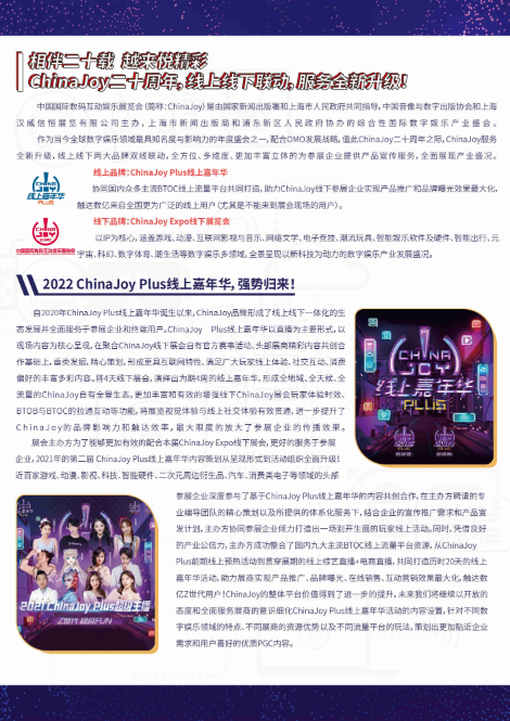 2022年,配合OMO发展战略,在喜迎二十周年之际,ChinaJoy全新升级,线上线下两大品牌双线联动(线上品牌:ChinaJoy Plus线上嘉年华;线下品牌:ChinaJoy Expo线下展览会),将全方位、多维度、更加丰富立体的为全球参展企业提供产品宣传服务,全面展现展会盛况!