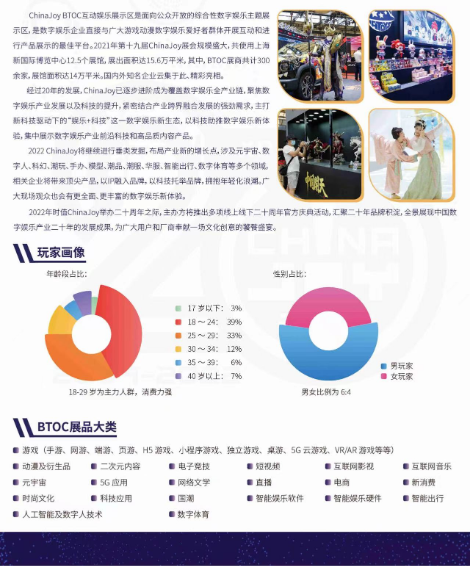 经过20年的发展,ChinaJoy已逐进阶成为覆盖数字娱乐全产业链,聚焦数字娱乐产业发展以及科技的提升,紧密结合产业跨界融合发展的强劲需求,主打新科技驱动下的“娱乐+科技”这一数字娱乐新生态,以科技助推数字娱乐新体验,集中展示数字娱乐产业前沿科技和高品质内容产品。