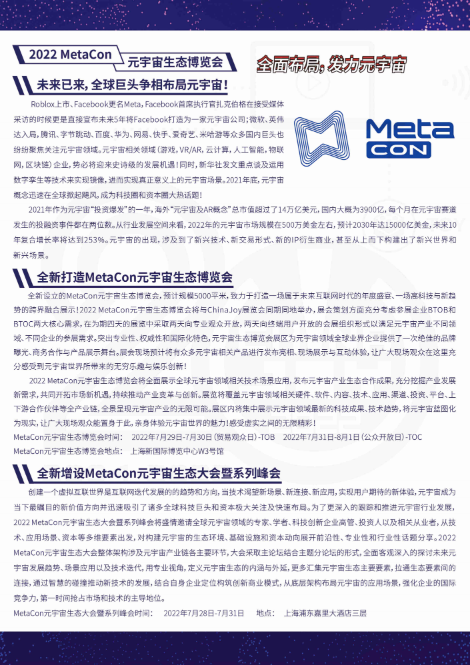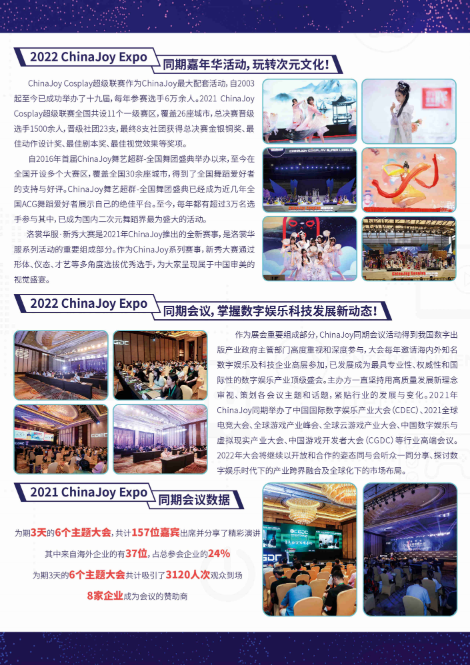 同时,2022年ChinaJoy二十周年盛典,将在往届ChinaJoy成功举办的基础上,与时俱进、全新升级。展会聚焦科技变革时代数字娱乐产业的发展和提升,紧密结合产业跨界融合发展的强劲需求,经过展览品类的逐年衍生积淀,在成功进阶成为以游戏为主,覆盖动漫、电竞、网络文学、互联网影视与音乐、潮流文化、智能娱乐软件与硬件等相关领域的数字娱乐产业国际交流与合作平台的基础上,主打新科技驱动下的“娱乐+科技”这一数字娱乐新生态,以科技助推数字娱乐新体验,把握新科技脉搏,集中展示数字娱乐产业前沿科技和高品质内容产品,元宇宙、5G、云游戏、AI、VR/AR/XR娱乐产品,将在这里精彩呈现!