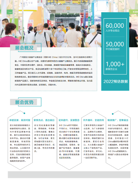 广州国际大健康产业博览会(IHE China大健康展),是大健康产业领域知名的国际性专业展会,已成功举办到第30届。为顺应行业发展,2022第31届广州国际大健康产业展览会于2022年06月16日-18日在广州广交会展馆举办。
