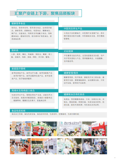 展会致力构筑以保健食品及营养补充剂、中医药及保健品、燕窝、益生菌、美容养颜、保健养生及医疗器械、健康管理服务及跨境医疗、保健品包装及生产设备等大健康细分行业为特色的商贸平台,共同为业内人士打造行业权威的国际交流盛宴!