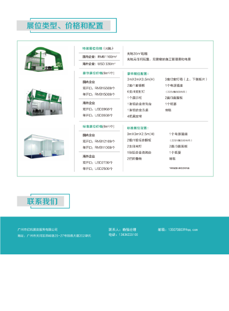 豪华展位(3 m×3m) 海外企业 USD 3968/个 国内企业双开口 RMB 16500/个 单开口 RMB 15000/个