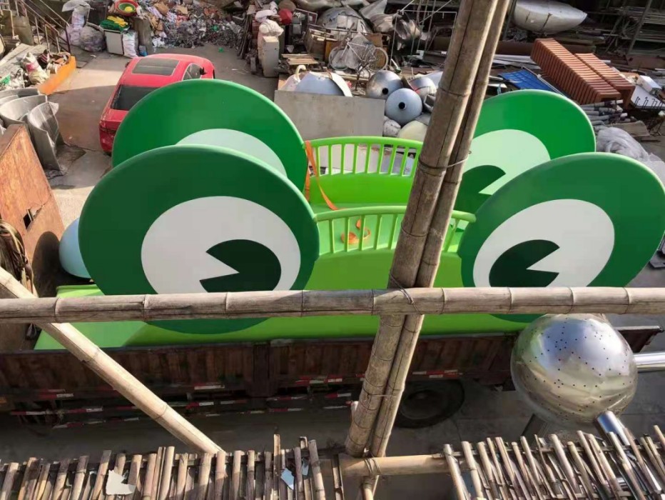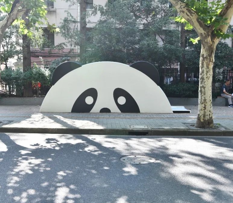 作为此次艺术季的新作,策展团队在狭小的社区街道引入了一个迷你“动物园”,希望在小场地也能够带来大地艺术的尺度感。因此,一个超级体量的青蛙王子从大地浮出,露出超大的眼睛环顾四周,熊猫宝宝也从另一侧爬出地面,四处张望,他们好奇地寻找社区的小朋友们,邀他们一起来玩耍。他们庞大的身体似乎掩藏在地下,无形中从视觉效果上拓展了社区空间的尺度想象力。这两个超级宽大的动物滑梯,可以一家人一起滑下,也可以很多小朋友手拉手一起玩。更多的小动物椅子在青蛙王子和熊猫宝宝的召唤下从草丛和树林中跑出来和社区的小朋友们玩成一片。
