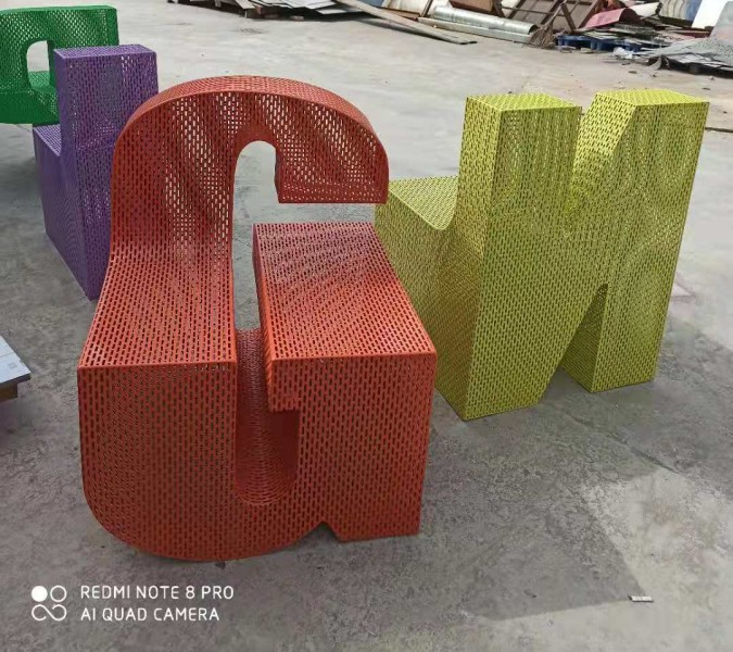 字母坐凳-均匀的不锈钢网格制作不同的字母造型、不同的字母拼接成一组英文单词、单词拼成一句英语,英语的语义可根据你的场地需要或文化代表做底蕴,通过英语表达出不同的意境,字母坐凳其实用性以及语义表达、均可给人们进入这里从环境带来不同的视觉、触觉感受。