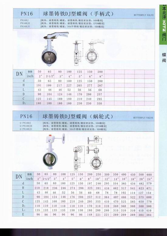 日本北泽KITZ对夹式蝶阀不仅结构简单、体积小、重量轻、材料耗用省,安装尺寸小,而且驱动力矩小,操作简便、迅速,并且还同时具有良好的流量调节功能和关闭密封特性,在大中口径、中低压力的使用领域,蝶阀是主导的阀门形式。手柄式 型号:PN16DJ (球墨铸铁蝶板) 蜗轮式 :G-PN16DJ (球墨铸铁蝶板) PN16DJU (不锈钢蝶板) G-PN16DJU (不锈钢蝶板)
